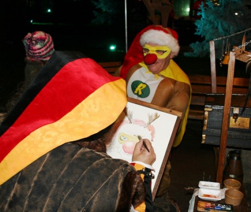En déambulation burlesque avec soit un vieux landau 1900, une vieille brouette en bois aménagée, ou encore un vélo coloré et sa remorque, tout cela sonorisé (répertoire de chansons de Noël) et accessoirisé sur le thème NOEL (guirlandes lumineuses, objets, cloches et santons), le personnage aborde un groupe avec quelques mots d’humour, un petit tour de magie ou un gag, sort deux sièges sur lesquels il s’installe avec le « piégé » puis dessine rapidement la caricature du quidam tout en dissertant sur Noël et l’hiver… Au bout de quelques minutes, il offre le dessin avec quelques phrases rigolotes… Et il lui arrive d’offrir un bonbon à un enfant qui passe…